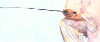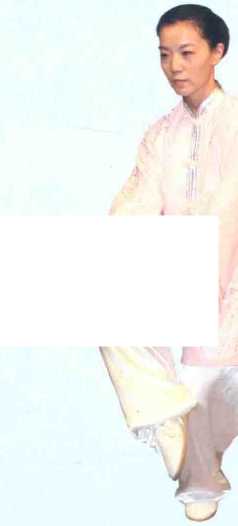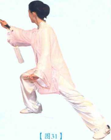 2 [图29][图29].重心移至左腿,右腿屈膝提起; 同时两前臂向内划弧合于腹前,手心朝 上,剑尖朝前;左手剑指捧托于右手背 下;目视前方。(见图30)