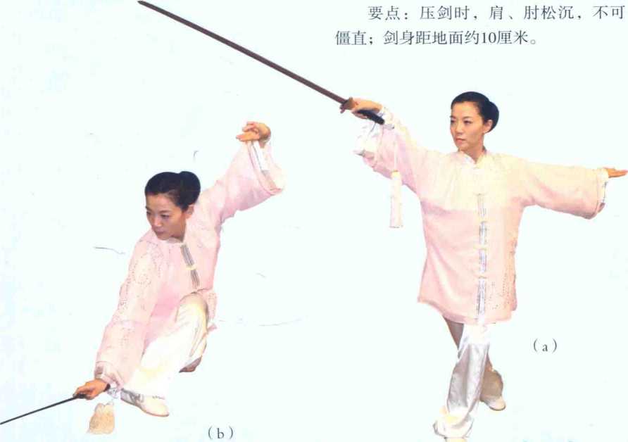 要点:捧剑耳提膝、崩剑与弓步要协 调一致;崩剑为一发劲动作,要转腰、沉 胯,发劲松弹;整个动作要连贯。