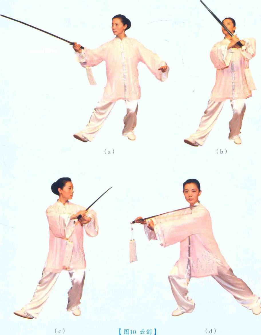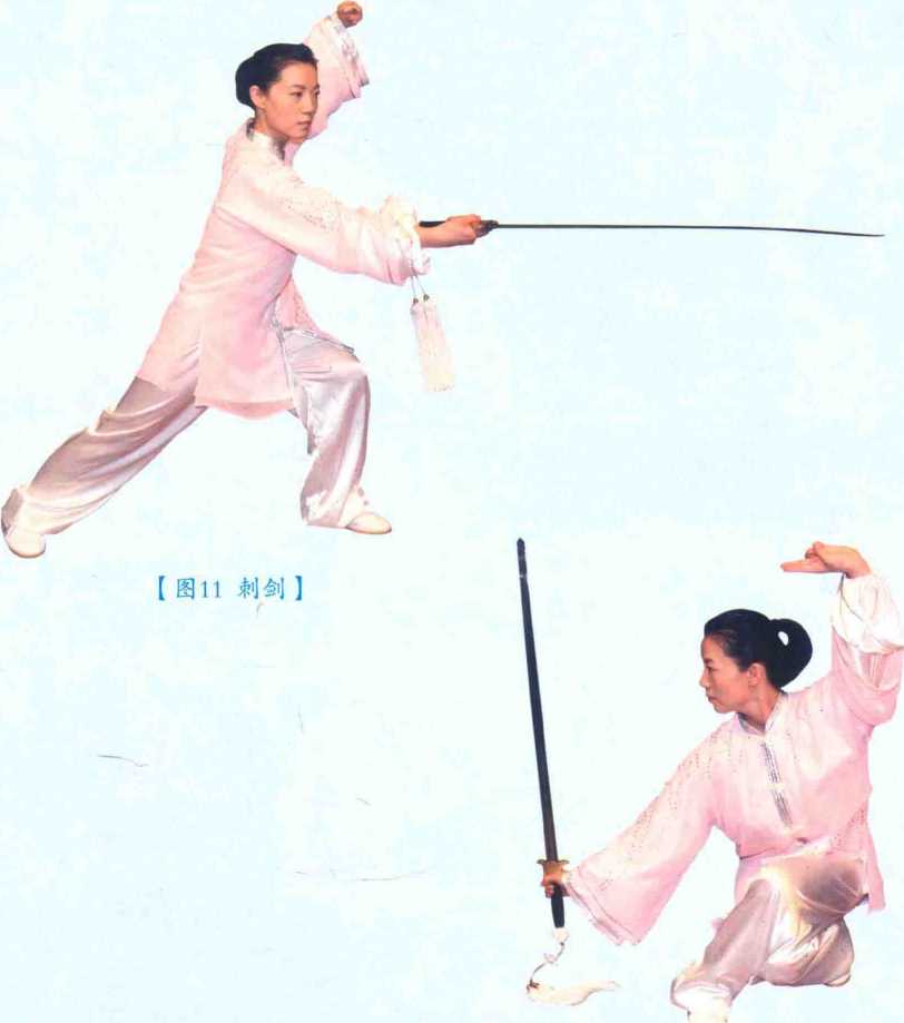 攻守兼备型剑法。剑身在头上方平圆环绕,既可进攻对方头、颈部,也可避护拦 开对方的进攻。(见图10)从剑身形状可分为直刺(剑刃朝上下)刺与平剑(剑刃朝左右)刺两种。从方位 可分为上刺、平刺、下刺。要求从腰间发力使剑身向前刺出,力达剑尖,臂与剑成一 直线。(见图11)12.崩剑指立剑,沉腕,剑尖由下向上突然翘起的动作。(见图12)