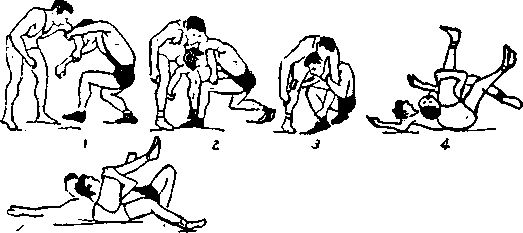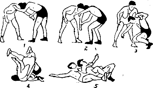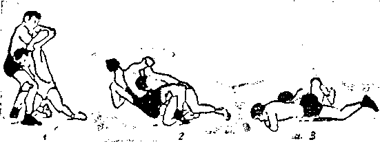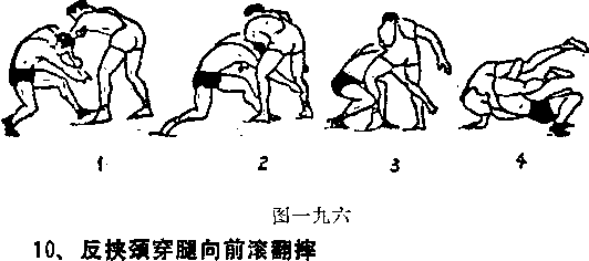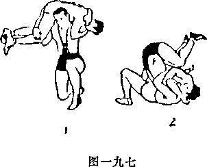 接对手左臂,上左脚于对手左脚内侧,头从左臂外向里 潜入对手胸下,右手从对手裆中穿过抱住对手右腿,上右步 于对手左脚外,用右腿挡住对手左小腿(图一九六3),然 后抬头,挺胸腹,向后靠倒对手。