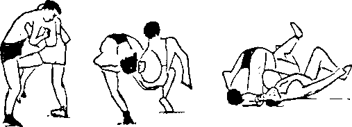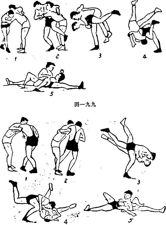 对手右站立、自己左站立,左臂插捧对手右臂、右手握 住对手左大臂,上右步于对手左脚处,脚尖外转,拉右臂,上捧 左臂,左腿直插对手左膝关节外侧,向后用力、体前屈、甩 脸,将对手沿自己左腿翻转过去,摔成肩背着地,并控制 住。(图一九九)