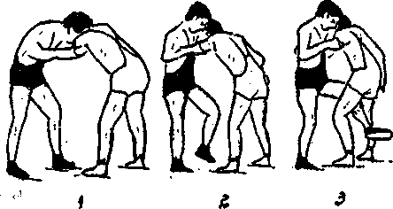 都是左站立,相互右握臂,左捧臂,捧臂的左手先改握对 手左臂(也就是双手从里面抱握对手左臂),上右步于对手 左脚前外处,左脚从对手裆中插入用小腿回勾对手左小腿, 身体前倾向下压,向对手被勾起的左腿方向用力,将对手摔 成仰卧,并控制住。