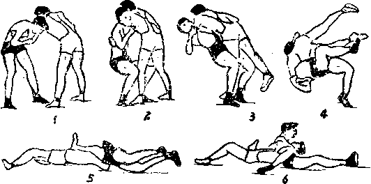 腿,双手握抱紧向后倒体,抬右腿,将对手整个身体抬起, 向右转体,将对手摔成仰卧,并控制住对手。