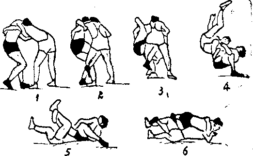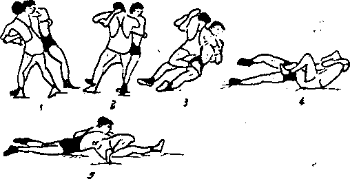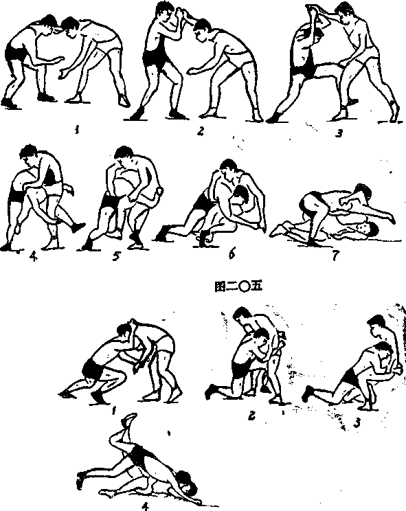 自己左站立,对手右站立,并用右手握自己颈,先用双 手做摘拉臂动作,蹬右腿,上左步用左小腿从后面勾住对手 的左小腿,头潜到对手胸上或左腋下部位,左手从后、右手 从前面在对手胯部搭勾,将对手摔成左体侧着地,然后换手 控制对手(图二。五)
