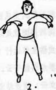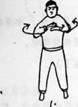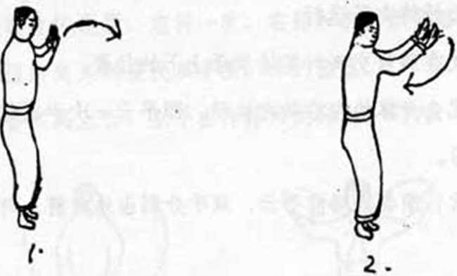5、前立云横步站金双掌心向前在胸前成预备式双手向前,向下向后作椭圆运动反复练习。