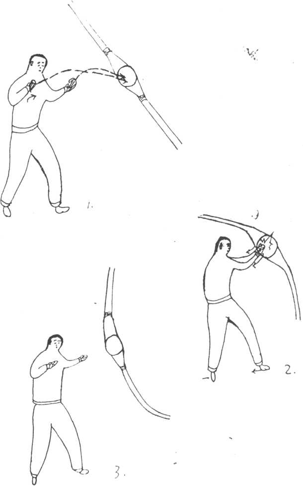 1劈柴式的发力(见大纲69页)。2劈柴式速度球练习法。左实战式立于速度球前左脚前挪半步以腰带手双—26-簟向速度球皤力有寺猛劈快收还原成定耗式反裒练习。)劈沙包练习(可参考速度球练习法)。4劈柴式的实战技法运用。