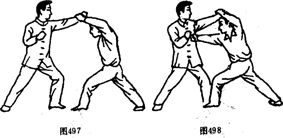 【实际用法1以右实战式为例,出上直拳引敌击我头部, 我则速用左臂上架敌臂(图497),而后速跟步进身,以右下 直拳猛击敌软肋空档(图498),攻敌后速撤回原实战式。(三)本由它拦打法 ’“ 一,.? , *【实际用法i以左实战式为例,以左引拳开路,至敌用 右直拳向我进攻,我则迎敌前迈一步,同时右肘弯屈90°横开 敌小臂(图499),而后左脚进步作插步配合,瞬间再将右拳速发出横抡敌面(图500),达到本能出击后,速还原实战式。图499 图500【要点】横肘拦截敌臂与插步后出拳要协调一致,左转 身还原实战势要快。