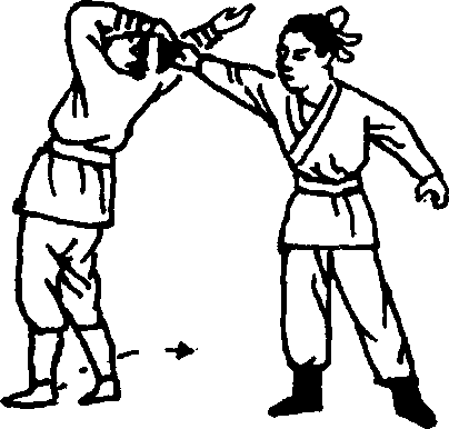 要点:向上举手,后仰及顺势右转体上步配合要协调, 手臂后击敌颈要有爆发力。