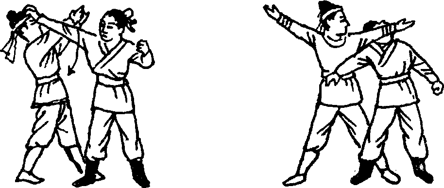 敌若在后抓我发,我即将右手举起顺势身体向后跌仰 (图26),这时左脚随身右转顺敌发力方向上步与敌成同方向