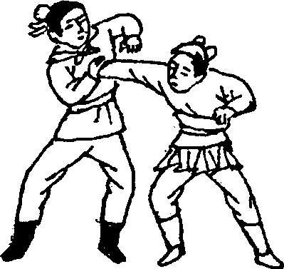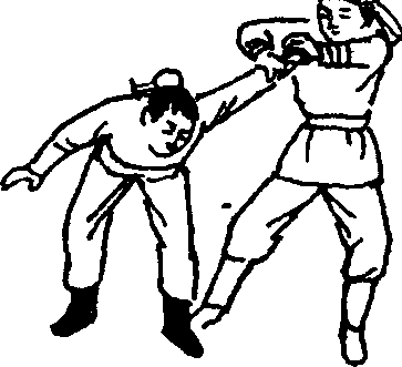 要求:肘关节弯曲要快,带敌肩要有力,提膝击敌腹要 稳、准。