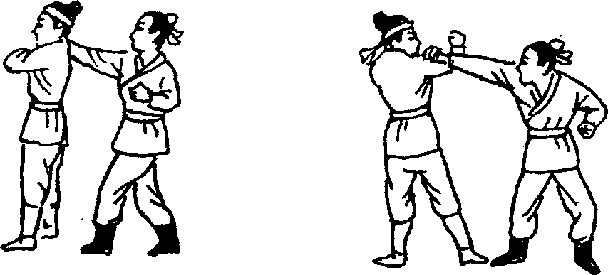 敌以右手扣压我右手置其肩上,同时用左手推击我右肘 关节时(图42),我当速用反擒拿方法破其攻击。其方法是:我 在敌未推肘之一瞬间,速将肘关节向下弯曲,致敌推击我肘 关节落空(图43),当敌推打落空后,我右手用力将敌肩带至 我体前,速提膝连击敌腹,我即可解脱(图44)。