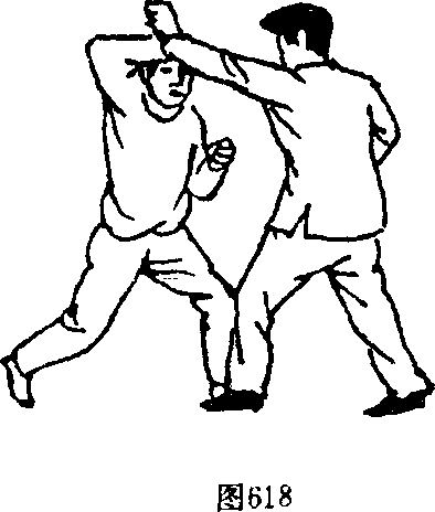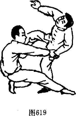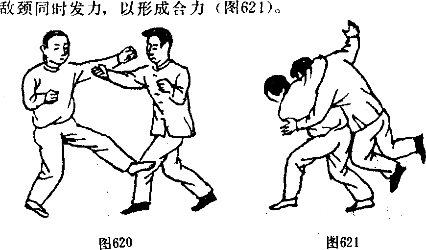 【实际用法】与敌相对抗,我由左实战式开始速起右腿 向敌膝下部位攻击(图620),待敌将腿向后躲闪时,我则速将右 脚前落进身,同时左转体18()以背部与敌前身紧贴,同时用 双手夹住敌颈,敌因头颈要害被控制而不能挣扎,此时我再 将臀部翅起致敌身被我撅起而跌出。臀部上翅要与双手前拉