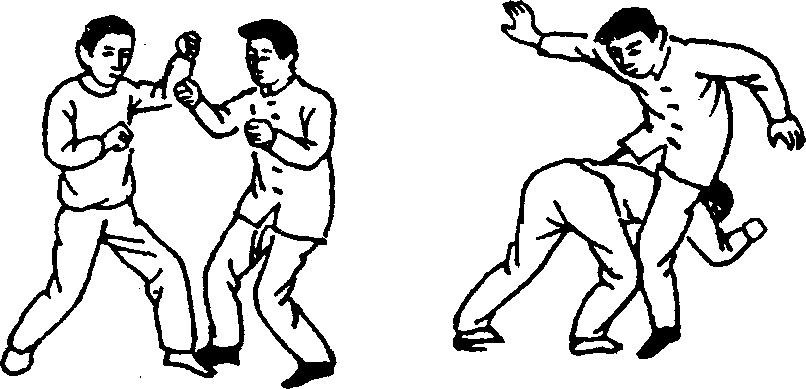 【实际用法】敌我相对而立,我以左摆拳攻击敌头,当 敌向后闪避我摆拳时(图652),我则迅速将右腿迅猛插入敌 两腿之间,右大腿根紧靠其裆部,致敌双腿被控制。然后我 上体双臂压住敌双臂采用胸部力量用力挤压敌胸。敌因前后 移动受阻而被我上体冲挤撞压向后跌倒(图653)O