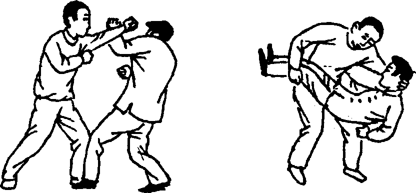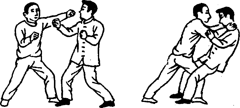 【要点】摆拳要迅猛,直腿摆入敌裆后上体要随之进身, 贴敌身时胸部挤压要有力。