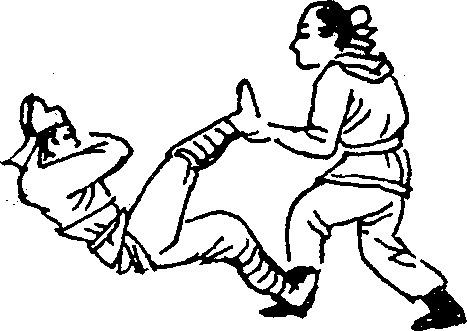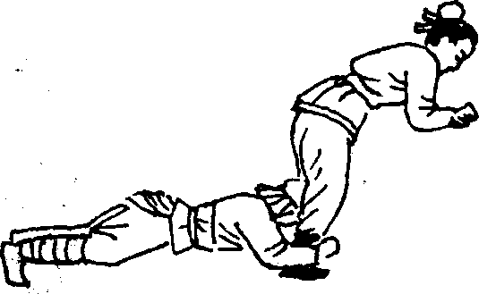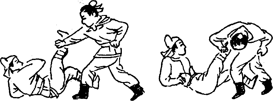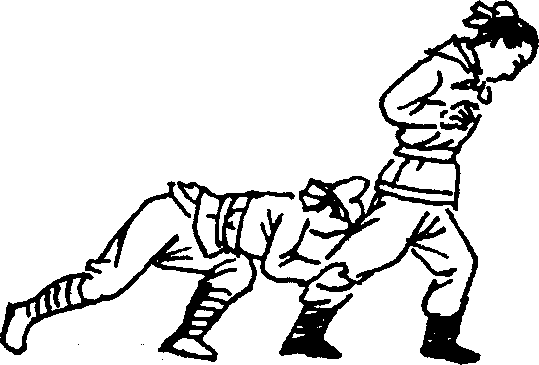 【技击动作】敌被我击败欲逃时,我速前抢一步并俯身 下跌前扑,前扑中我速用双手拦敌两小腿部位,同时用头顶 击敌臀部,敌因我双手阻拦,臀部被顶,而向前跌倒(图125、 126)。