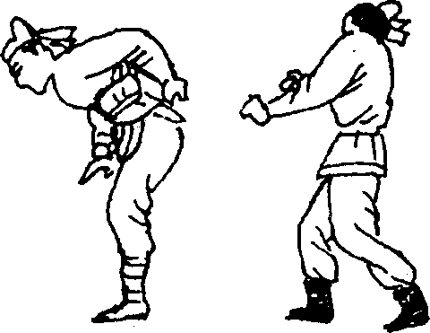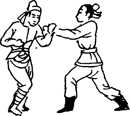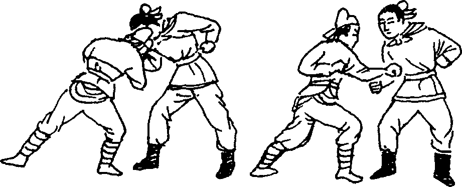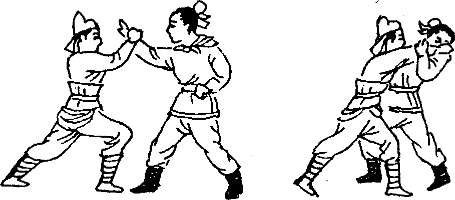 【技击动作】敌我相对,我以左顼备式应敌,突然右脚 右上,左手护胸,右手虚掌假攻敌面,引敌向我攻来(图〔33、 134)。当敌真向我右侧攻来,我则突然左脚向左上方进身贴 敌,造成敌向右侧进攻参空,此时用上体向敌上体压去,右 手掌在上体前倒时推击敌臂(图135),形成懒睡云床之式。