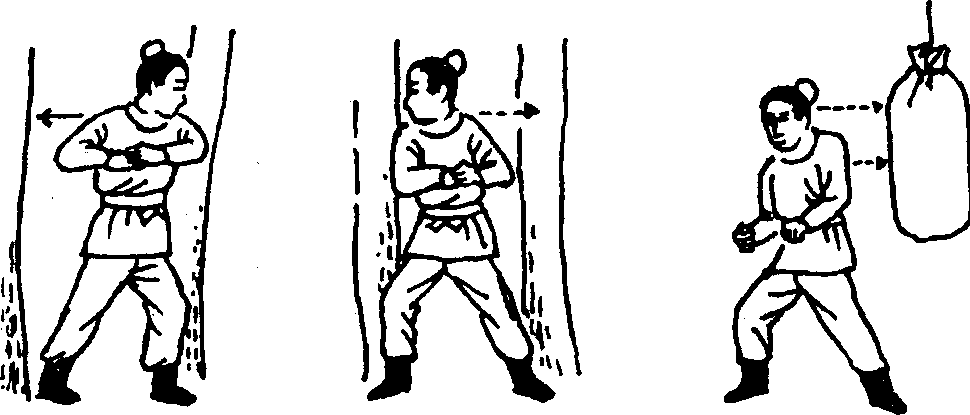 用大臂左右交替撞击两侧木桩,撞击力度要坚持循序渐进的 原则,若无木桩,可用沙袋代替。练功者以实战姿势站立, 意念行置臂部,身体后倾抬腿,用力向沙袋撞击。撞击一面 后,再撞击另一面,撞击力度逐渐增大。(图4、5、6)