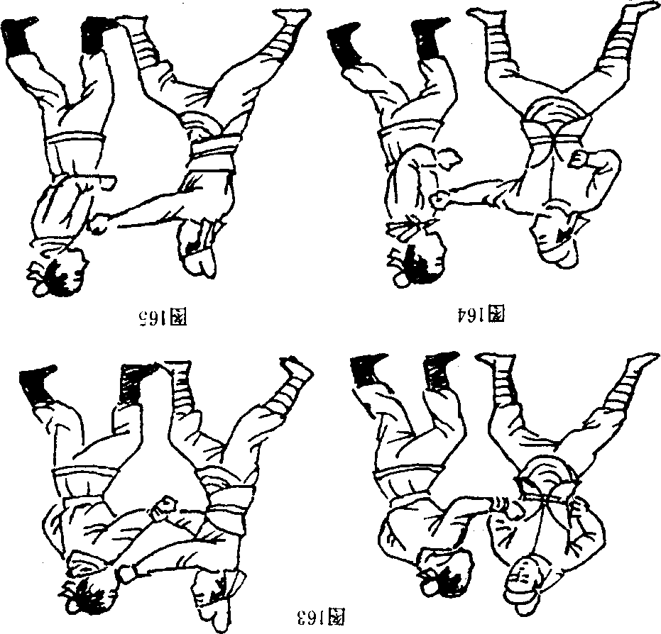 【技击动作】我以右预备式应敌,敌以右直拳攻我面门, 我上体略后仰(图163),同时右脚速震步移置左脚之位,左 脚随右转体再移至右脚位置,同时右臂由上向下压敌右直拳 (图164),倘若此刻敌又起左拳攻我,我则顺转体之式再以 左臂由上至下压其左臂,待敌左右拳皆被双臂压下一瞬间, 我则出右上直拳击敌面门(图165),同时左拳击敌下腹(图 166)。当左拳击腹时右拳速抽回夹击敌胸部,最后形成震步 后以迅雷不及掩耳之式连发三拳击敌(图167)O