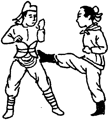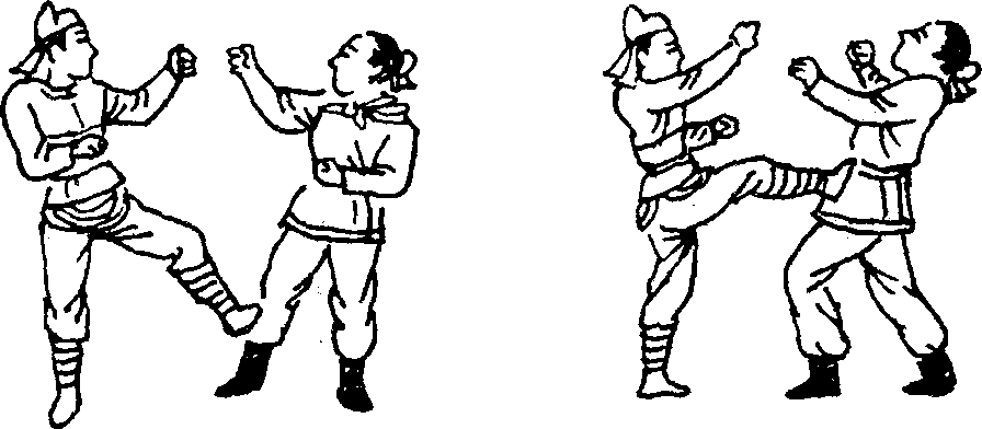 【技击动作】在与敌对阵时,我先引腿逗敌(图267), 待敌出实腿踹我下体时,我则速后滑一步,然后再起左腿将 敌低腿踹下,紧接起右高腿踹敌胸、腹部(图268).引蛇出 洞后,再反攻,敌因低腿被踹而上体遭我侧踹。