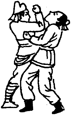 【技击动作】在与敌打斗中,敌若运用右脚向我肋部踹 击,我由预备式应敌,速将右脚后撤一步,同时出左肘用小 臂下压敌起踹之腿(图269),待敌腿被下压之一瞬,我则速 上右步,随之出右肘由下向上用肘尖击撞敌面(图270),形 成蛟龙闹海之式。敌因右腿被砸落而受到我肘部攻击。