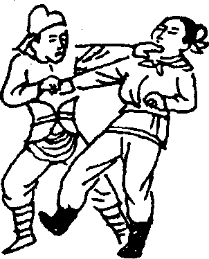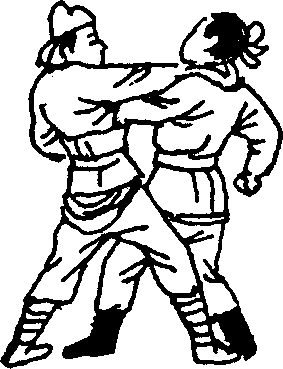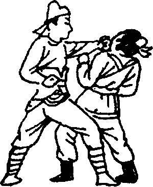 【技击动作】在与敌短兵相接时,敌以左直拳向我面部 击来,我速出左手将敌左腕刁住(图292),随之右脚上步别 住敌腿右掌向后切击敌颈部(图292)。 使敌受到上切下绊 夹击,不能施展其招而败之。