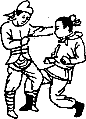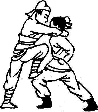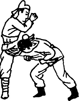 【技击动作】在与敌相斗时,敌若用右拳向我腹部攻来, 我则速起左手将敌拳刁住,而后速上右脚置放膝上,同时用 右肘下击敌头(图301)o图301106 .卧虎窜林阴阳式【技击动作】在与敌近搏时,敌若将我腿抱住欲摔,我 则速起右肘下砸敌背,致敌因背部受击而前倒(图302)。图302107 .夜叉勾梁阴阳式【技击动作】在与敌相斗时,敌若用劈拳下砸我头,我 则速上左腿置敌膝后,而后左手抓肩前带,右腿用力勾绊, 致敌因上体被拉,后腿被绊而向后跌倒(图303)0图303