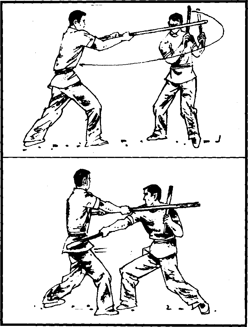 6 我方用右棍上挑对手的长棍同时用左棍攻击对手的腹部。