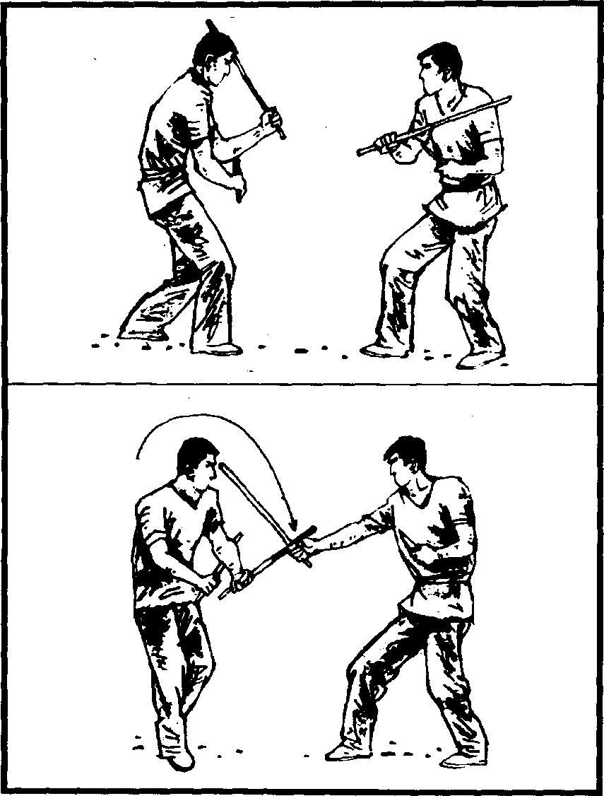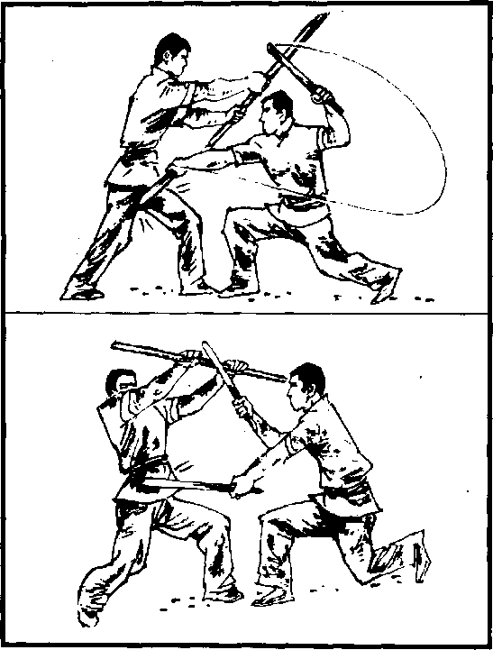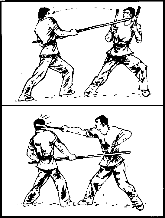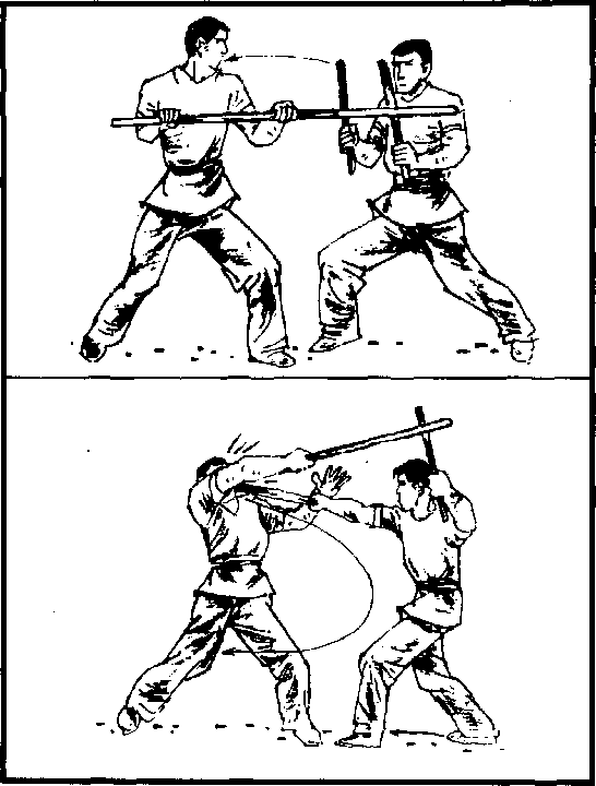 4 我方用左手将对手的长棍上挑同时用右棍猛击对手的面部。