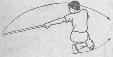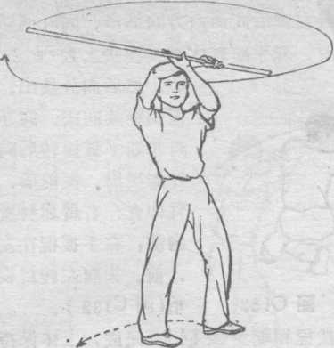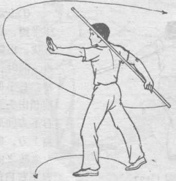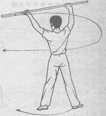 ② 上动不停, 右脚向西南方向上 半步.同时,上体 继续向左转;右手 握棍随转体屈肘内 收至头前,使棍梢 由左肩后向东、向 北、再向西划弧平 摆一周;左手随之 略上举,用虎口在 右手前接棍(图C 130) .