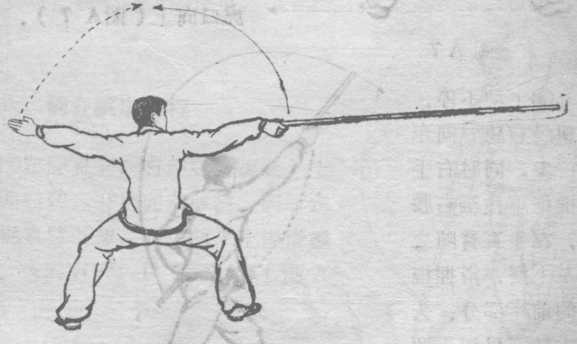 上动稍停, 左腿屈膝不动, 右腿屈膝向左腿 靠拢跟步。同时 上体路向右转, 双手持棍由左肩 前尊上体右转而 下拉至右腰间, -使棍梢由肩上向图A5 前直劈至身前,棍把在右小臂下,目视棍梢(图A 5 )。要点3右腿跟步,转体,双手下拉劈棍要同时完成。棍要 沿直线而下.图A6