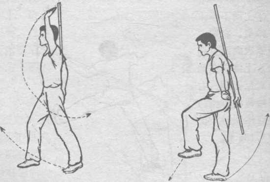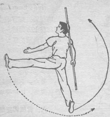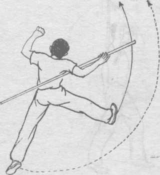 ③ 上动不 停,左脚落地后 蹬地起跳;右腿 随之直腿向后上 方摆起。同时, 左掌自然向前 摆;右臂保持背 棍姿势(图0 154).