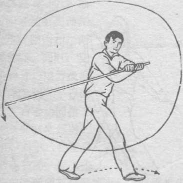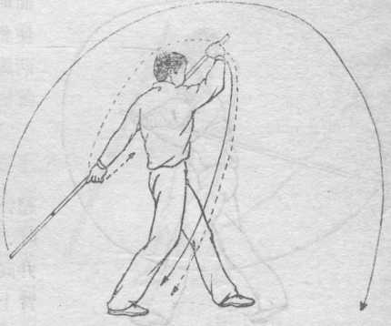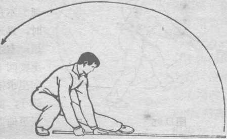 ① 上动不停, 以两脚前掌为轴, 上体向左下翻转, 带动左手直臂向 上、向左、向下、 向后划弧至身后下 方,右手协同上提 至右肩上方,使棍尖向上、向左向下,经腿后立圆划弧一周。目视前方(图D66; d要点:借上动压棍之反弹力,迅速翻转身,以身带棍,棍、 要贴身。② 上动不停,左手向上.向前,向下,右手协同向下。同 时屈右腿成仆步,使棍平扑地面.目视棍尖处(图D67)o图D67要点:屈腿,转腰一致,转腰带臂,力达棍前端。棍快至地 面时两手要向后抽拉, 使棍击地有力。仆步时 两脚均要扣地,踏实。