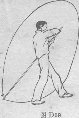 ②上动不停,上体左转带动 左手内旋,右手外旋并上提,至 头左上方.右手在外,手心向 里;左手在内,手心向外。使棍 尖向下、向前划弧至前方时,上 左步。同时,左手稍向后并变外 旋,右手变内旋并稍上提,使棍 尖端继续向后至体左侧。目视左 前(图D69 ).