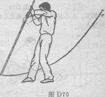 ③ 上动不停,上身 右转(两脚随之转动) 带动左手向上再经面前 向右,至右臂外侧,手 腕(内旋)下压。右手 协同向上、向后,手腕 (外旋)至左手腕下 方,虎口夹棍,使棍尖 端由后向前、向上、向 后立圆划弧一周。目视 棍尖处(图D70 )。