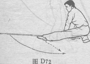 ⑤ 上动不停,重心? 后移,右腿向后撤步. 并屈腿成左仆步。同时” 两手协同用力向下拉压 (左手稍向前滑把), 便棍向上、向前平扑于 地面。目视棍前端(图. D72)。