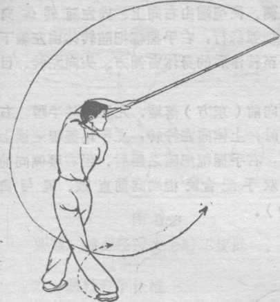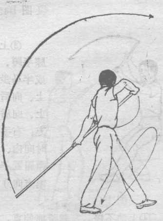 左脚向正东上半步, 御尖外展.同时,上体向 无转3双手握棍向下、向 '后摆,使棍端由前向下、 经左腿外侧向后划弧竟 彳亍,使棍梢下挂。头向左 会,目随棍梢(图B46)3