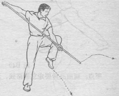 T,划弧绕行至左腿内侧,使棍端由右向上、向左随转体向 下、再向转体后的前方划弧绕行;右手握棍把随转体由左腋下 向上、向左划弧绕行,至转体后的身体右侧方.头向左转,目 随棍端(图B48 ).
