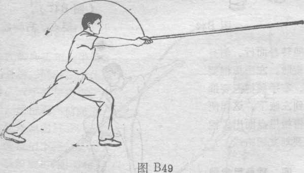 ② 上动不停,左脚向前(东方)落地,左腿屈膝半蹲,右 腿蹬地伸直成弓步.同时,上体向左拧转;左手松握棍继续上 摆至与肩平,左臂伸直;右手握棍把随之屈肘,经右腰侧向前 直臂推送与左手靠拢,双手配合使棍端向前直戳.棍与肩 呼,目视棍端(图B49)。