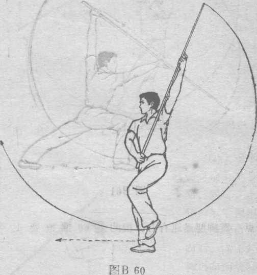 ① 左腿伸膝站起,同时右腿屈膝上提,然后向下落脚下 震。左堡随之屈膝上提。与此同时,右手握棍把先宜臂后屈 臂,由下向上、向内划弧收于腹前,使根端由下向前、向上、 向后划弧上摆:左手随之直臂上举迎握根身(图B60 ) o