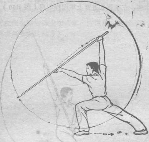 要点:震脚要迅速有力,棍的抡转推撩要心倒路 线。