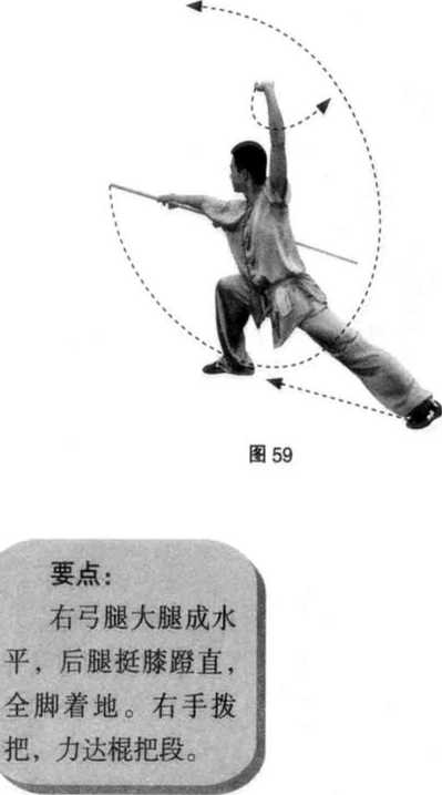 接上势,两脚同时落地,右腿屈蹲,成右弓 步;同时,右手握棍拨把至右腋下,与肩同高;左 臂撑圆上举;目视前方。(图59)