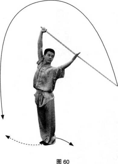 (1)接上势,左脚上步与右脚并步;同时,右 手握棍由前向下至体前,随即左手接握棍,右手滑 至棍把;身体左转,两手举至头上方;目视棍梢。 (图 60)