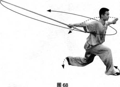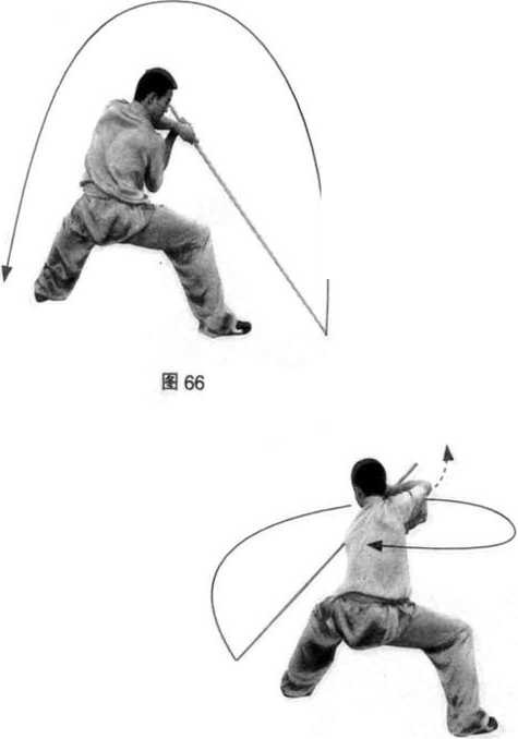接上势,重心微左移;同时,两手握棍经上向 右下、左下立圆摆落,棍梢触地;目视棍梢。 (图66、图 67)要点:提髓转胯,力达 棍梢。27. 扫棍接上势,身体右转,左脚蹬碾;同时,右手握 棍随转体经左向右平扫,左手向左侧平摆;目视前 方。(图68)49?0?49?0?49?0?49?0?