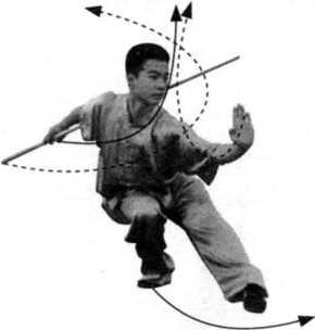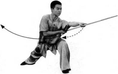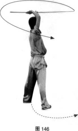 (1)接上势,左脚跟落地,右脚向左前方上步; 身体左转180。;同时,右手握棍使棍把向左上方提 起,左手至右臂下方接握棍身,两手握棍绞拨,使 棍梢随转体向左平云;目视棍梢。(图146)
