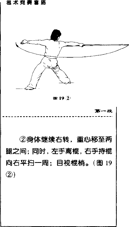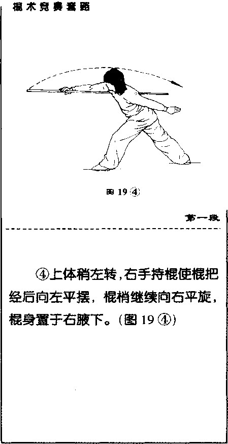 ①身体右转,右脚向后退步;同时,两手持棍抱于胸前。(图19①)39 19 ③第一双③上体后仰,右手持棍在胸部 上方平扫;目视上方口(图19③)国19⑤第一段