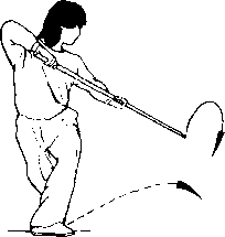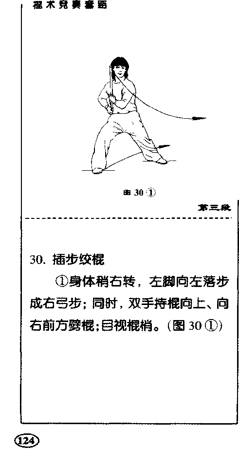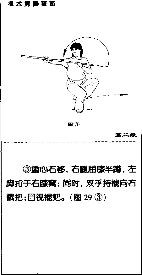 身体右 转;同时,双手持棍经后向左云拨;目 视棍梢。(图29②)@)第二段动作路线示意图S 30②