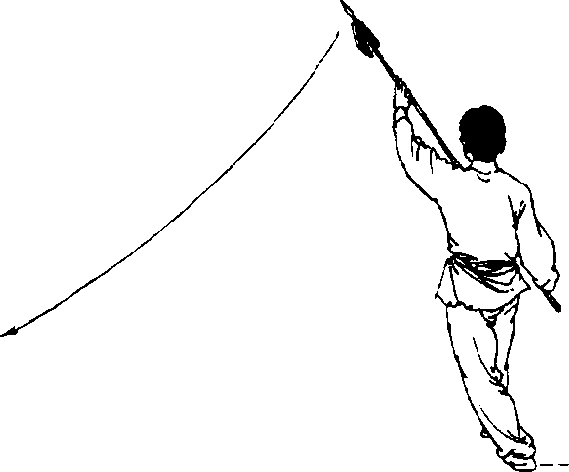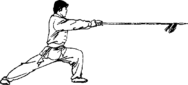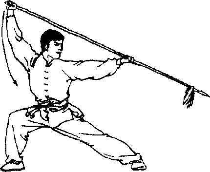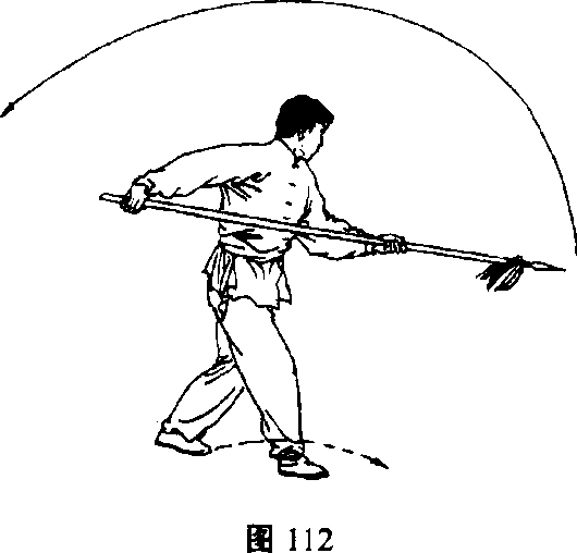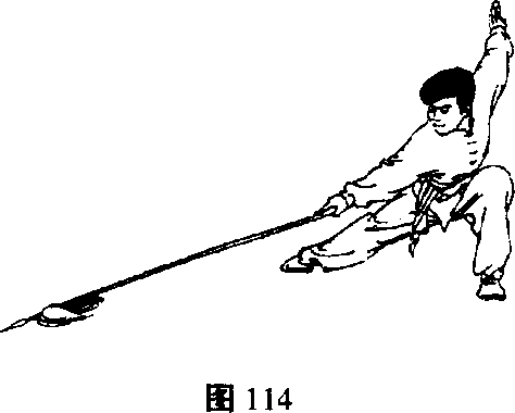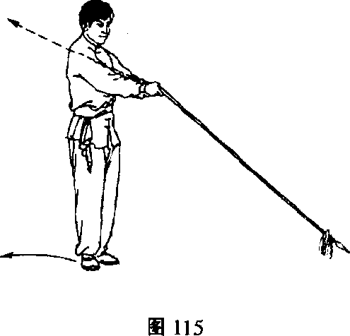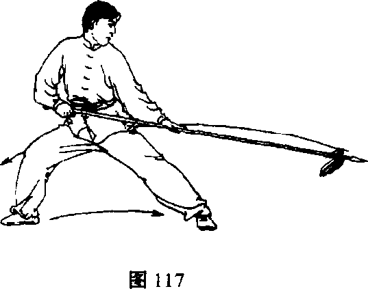 ;上体向 左上翻转,左脚向右脚后撤步,枪尖上行(图113);翻身成左 弓步,右手向右前下方、单手下扎枪(图114)。图111第二组:并步下扎枪T弓步架枪T弓步压枪―转身下拦 枪一?半马步拿枪一?弓步扎枪1. 并步下扎枪(图115)。2. 接上动。右脚向右移一步成右弓步;右手抽枪上架,伴 有上拦枪的动作(图116)o199图116