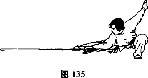 (图131);左脚向后倒插成叉步,右手向右下方撞枪,左手滑 把(图132)03. 接上动。两手将枪身横背于两肩背后(图133);向左 上方翻腰(图134) o图1314. 接上动。左脚向右侧后方撤一大步,成右仆步,右手握 枪由上向地面摔把(图135) o