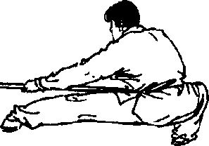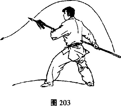 1)左脚蹬地,身体稍后坐;同时,右手回抽枪时前滑留出 枪把段,枪头稍高于枪把;目视前方(图203)o
