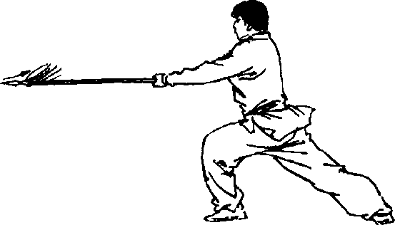 2)右脚蹬地,左脚前弓成左弓步,上体稍左转;同时,右 手握把向左手处伸出扎枪;目视枪尖(图202)。
